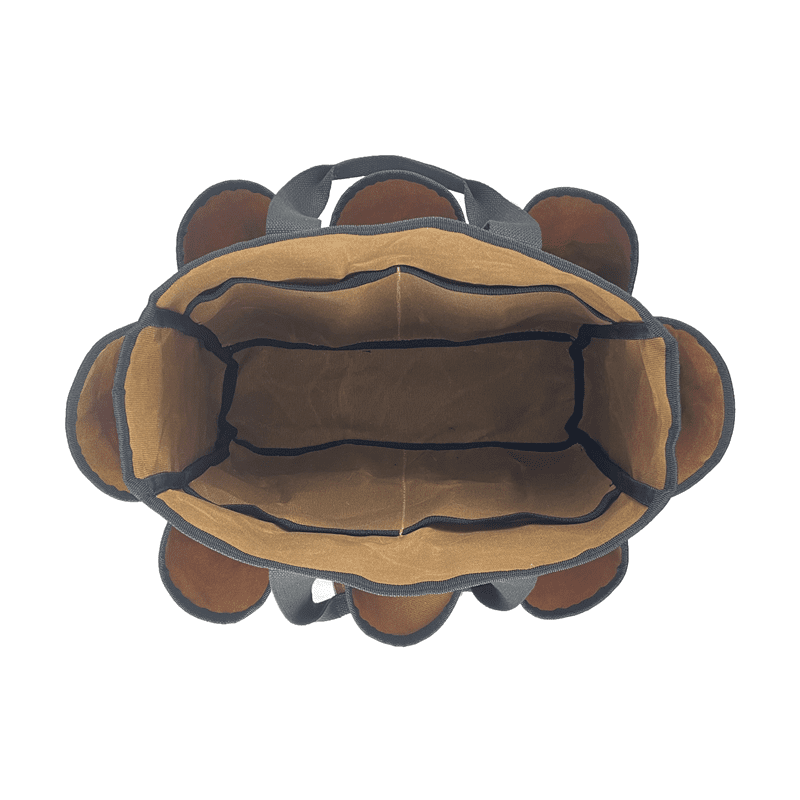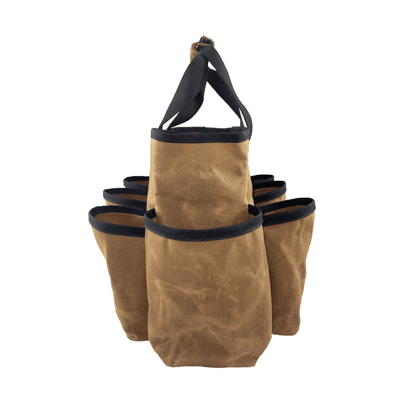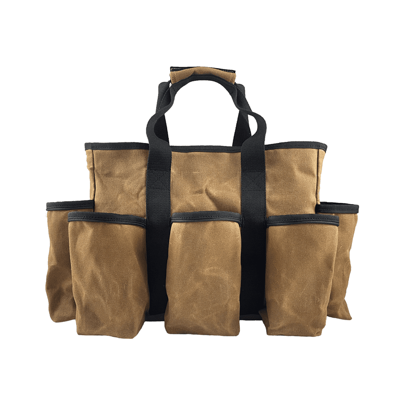 CGM-004 is made of 16 oz waxed canvas with heavy duty stitching and wrap-around handles. 12 pockets in total, with 8 exterior pockets and 4 interior pockets. The open pockets make it great for organizing a variety of tools and supplies. Perfextly sizes for the bottles and supplies of your choice. The waxed canvas and sturdy stitching make this can be a heavy duty garden tote bag.