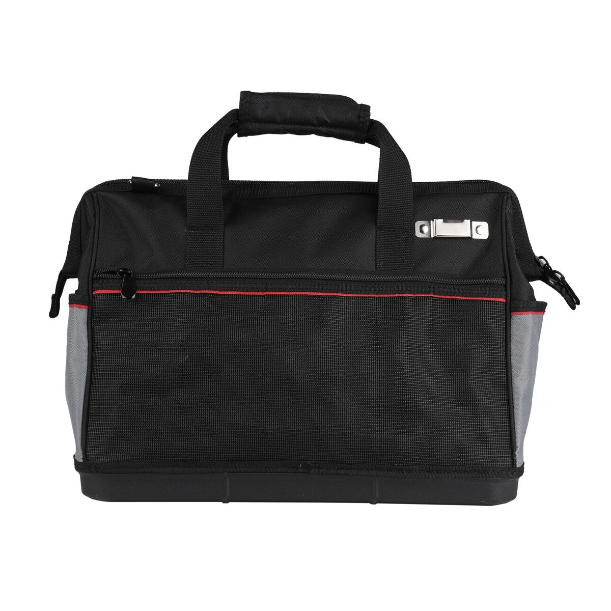 GM-008 18 Inch Tool Bag With Hard Bottom constructed with soft fabric handles and padded shoulder strap for carrying longer distances. Top zipped wide open mouth for easy approaching tools. Ideal for carrying hand tools and other small to medium items. Tool bag is designed with an adjustable strap allows for easy access to contents, the soft sided tool bag can endure hard wear and tear. Waterproof rubber pp bottom keeps bag sturdy, protects contents from hard falls. Closes storage equipped with a waterproof, sturdy rigid base. 12 external pockets, 10 internal pockets and large space to organize a variety of wrenches, pliers, screwdrivers, meters, and accessories.