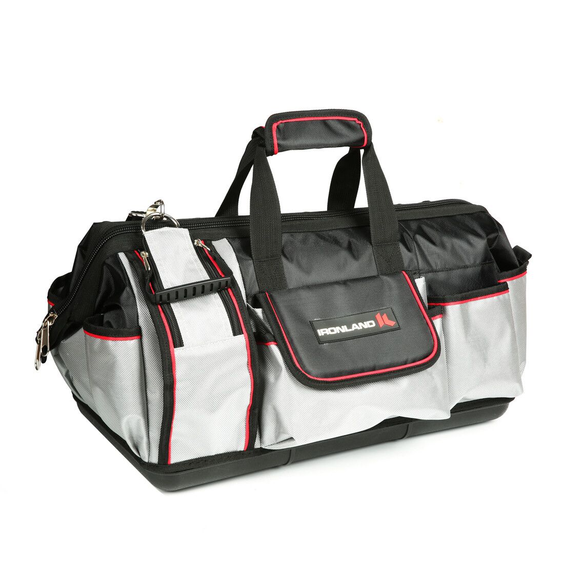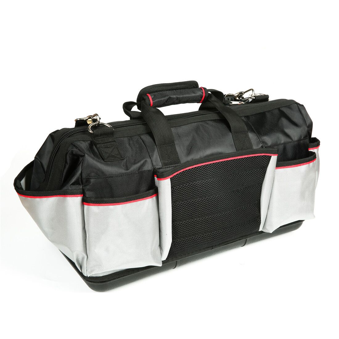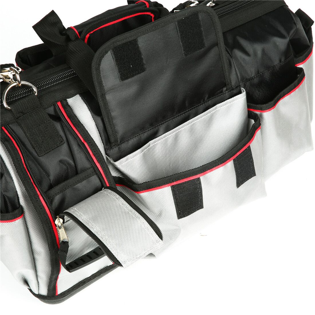 GM-012 20 Inch Gate Mouth Tool Bag is made of the most heavy duty 1680 denier fabric for long lasting durability. Rigid and waterproof plastic base molded to fabric. Padded shoulder strap allows easier carrying of heavy loads. Multiple use tool compartments for all storage needs with easy access pockets. Reinforced sides construction maintains shape and allows easy access. It holds 9 inside pockets and 11 outside pockets.