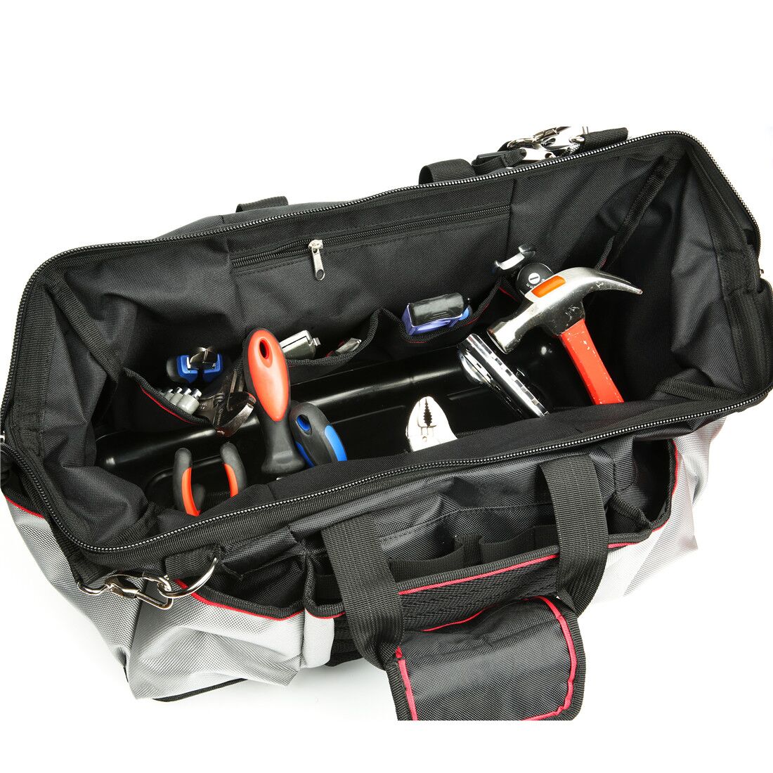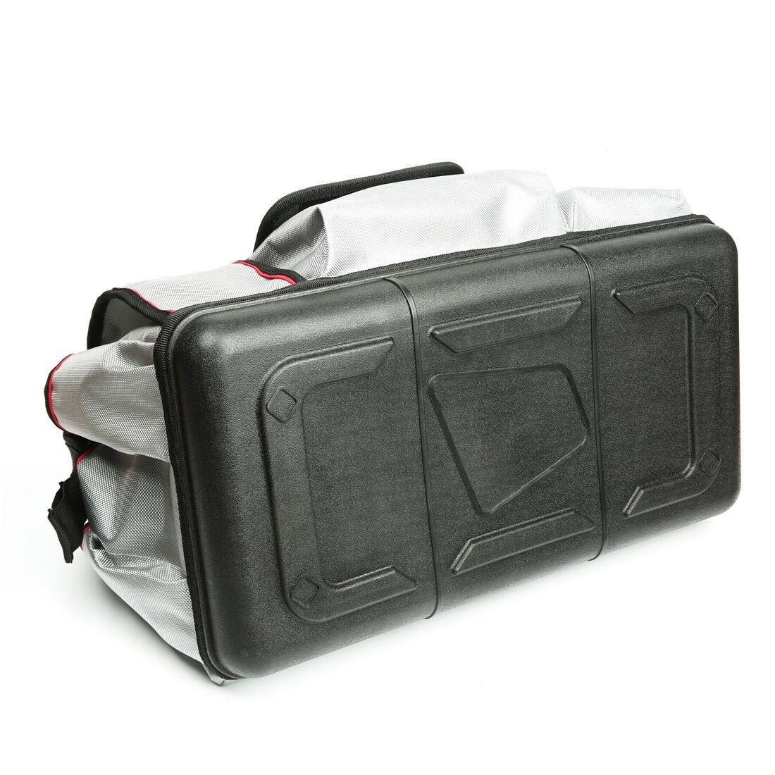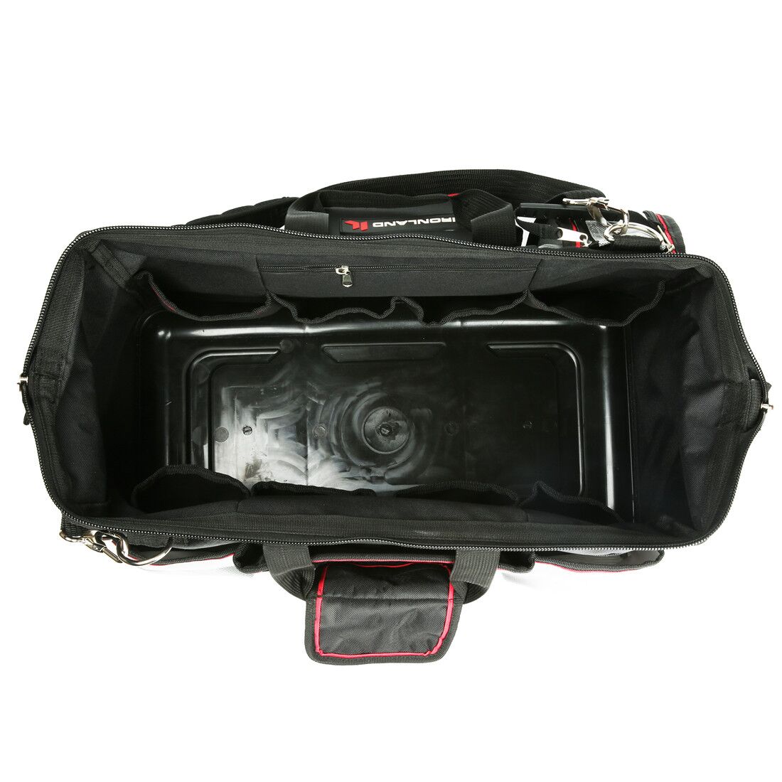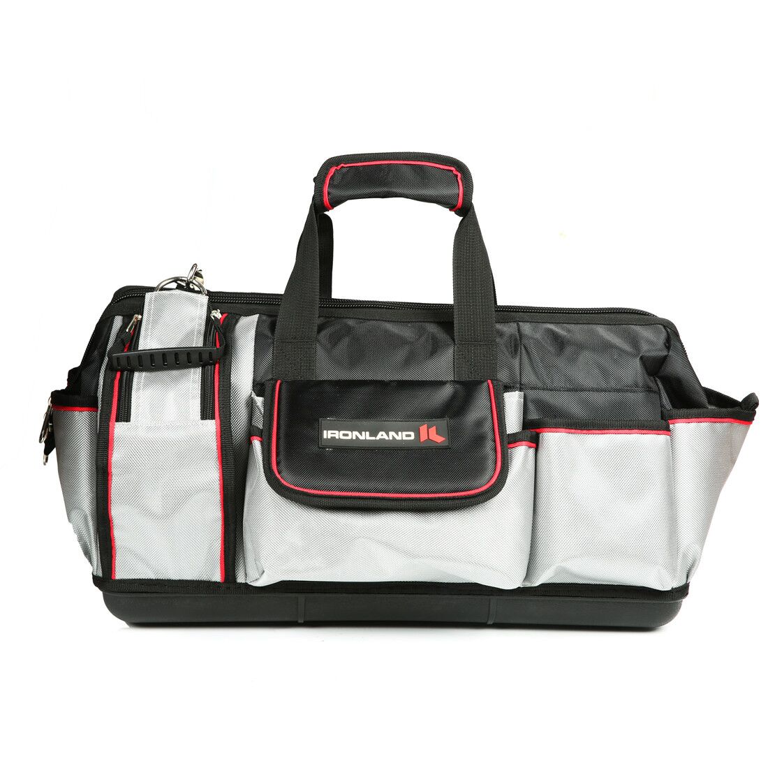 GM-012 20 Inch Gate Mouth Tool Bag is made of the most heavy duty 1680 denier fabric for long lasting durability. Rigid and waterproof plastic base molded to fabric. Padded shoulder strap allows easier carrying of heavy loads. Multiple use tool compartments for all storage needs with easy access pockets. Reinforced sides construction maintains shape and allows easy access. It holds 9 inside pockets and 11 outside pockets.