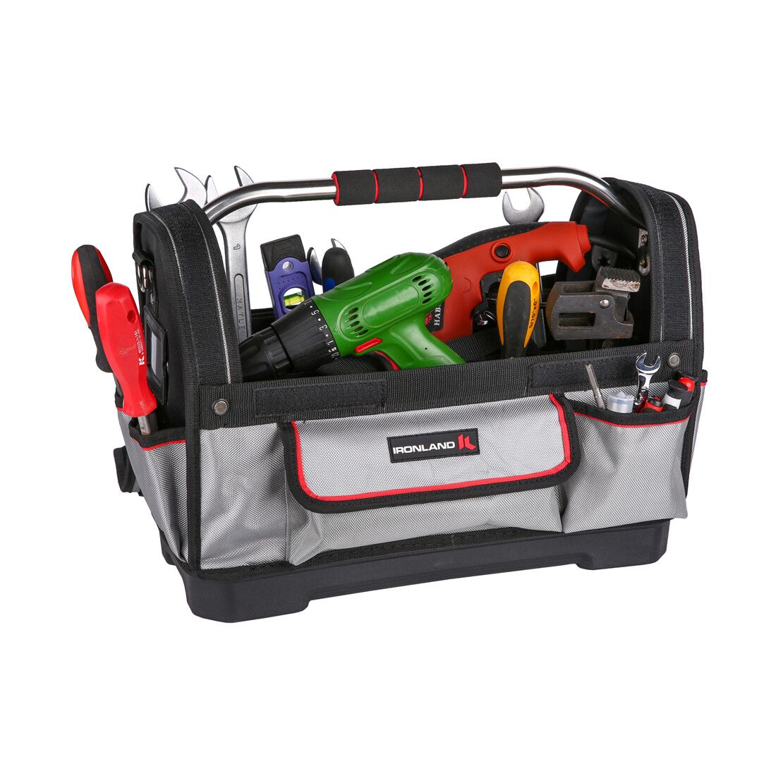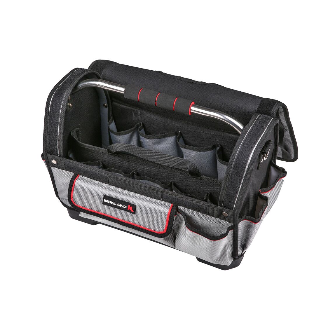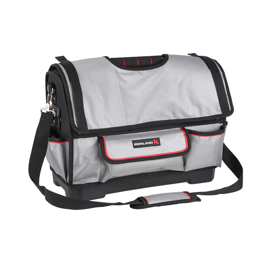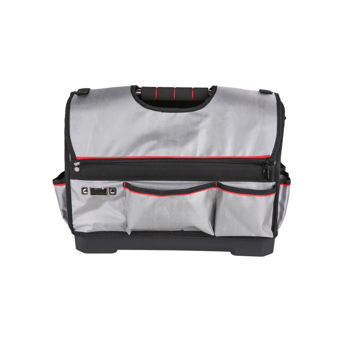 18″, 1680D Polyester, 8 External Pockets, 9 Internal Pockets, 24 Loops, Removable Tool Wall, Plastic Base, With Shoulder Strap
